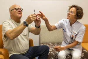 Hoewel andere regio’s ook veel doen om de zelfredzaamheid van patiënten en mantelzorgers te vergroten, gebeurt dat vaak gefragmenteerd en op kleine schaal. KOMPAZ biedt daarom in eerste instantie een tweedaagse cursus aan om een eigen trainingscentrum op te zetten, bijvoorbeeld aan zorgverleners van ouderenzorginstellingen, ziekenhuizen of welzijnsinstellingen. Bestuurder Matthijs Bosveld (MUMC+) deelt de kennis van de Maastrichtse academie met de nieuwe projectleiders. “We delen randvoorwaarden, financieringsmogelijkheden, juridische overwegingen en methoden om de kwaliteit en veiligheid te waarborgen. Door ook de samenwerking tussen thuiszorg, ziekenhuis en andere zorginstellingen te belichten, voorkomen we problemen bij de verplaatsing van zorg naar huis.” KOMPAZ stelt ook de trainingen beschikbaar.
